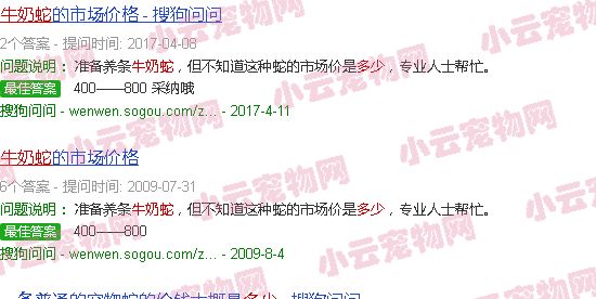 奶蛇是三大宠物蛇之一,价格略高,原色奶蛇的价格在400元左右,而变异的价格会更高,需要550元到1000多元。2.玉米蛇玉米蛇是饲养最多的宠物蛇,原色价格在200-300元,变化在350-800元之间。3.猪鼻蛇猪鼻蛇是近年来比较受欢迎的品种,猪鼻子会装死,非常可爱。品种多样,目前价格较高。