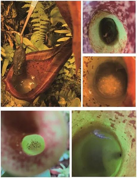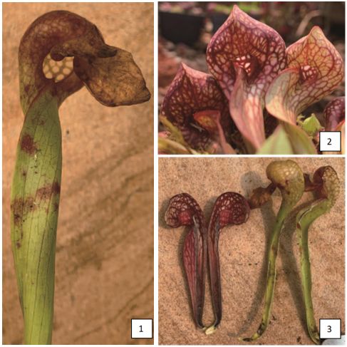 (1)眼镜蛇瓶子草的瓶口特写 (2)鹦鹉瓶子草的瓶口特写(3)鹦鹉瓶子草和眼镜蛇瓶子草的捕虫瓶内部都有向内的倒刺防止猎物逃走