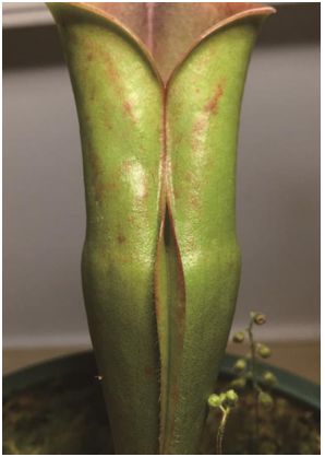 鹦鹉瓶子草甚至还和螺旋狸藻属(Genlisea)一样具备进入后无法后退只能前行的捕鸽器单向门原理。植物用刚毛作为类似细金属棒的功能,猎物一旦进入陷阱就只能靠推开单向向内的刚毛前行,后退就会被刚毛的朝向直接卡住,只得向前不得后退,直到进入消化液所在的区域,这就是同捕鸽器只能进不能出的工作原理一样的机关。