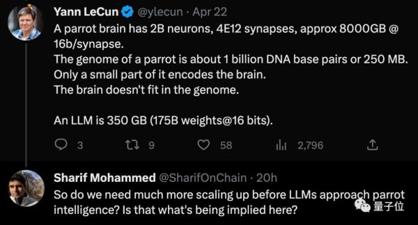 LeCun还进一步对比了鹦鹉大脑容量和当下LLM规模,有人提问,这是暗示LLM还得朝大规模发展下去?
