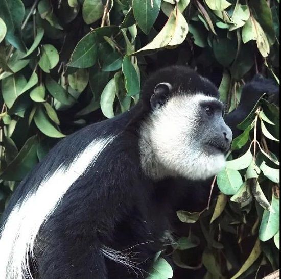 黑白疣猴的外形也十分有特色,身体两侧有飘逸的白色长毛,跳跃时长毛舒展开像张开的斗篷,气势十足。尾巴比身体还长,末端也有飘逸的白色长毛。