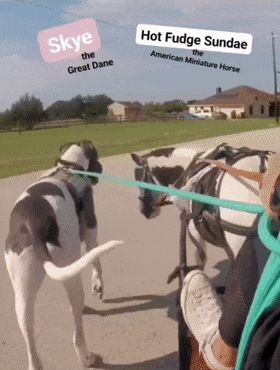 2岁的大丹犬Skye和12岁的迷你马Hot Fudge Sundae是一对很好的朋友!