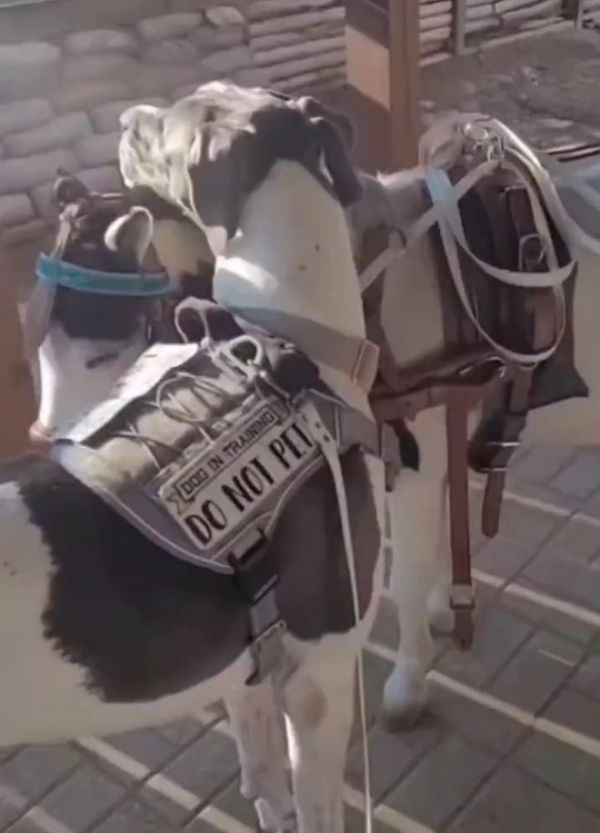 一个戴着牵引绳, 一个佩戴缰绳,两只一起拉着主人外出的时候,还是非常吸睛的!