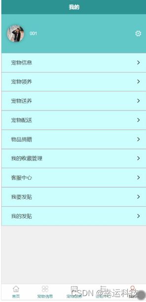我的,在我的页面可以查看宠物信息、宠物领养、宠物送养、宠物配送、物品捐赠、我的收藏管理、客服中心、我要发贴、我的发贴等详细信息,并可根据需要进行相对应操作,如图5-6所示。
