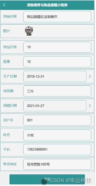 物品捐赠,在物品捐赠页面可以填写物品名称、图片、物品价格、数量、生产日期、保质期、捐赠日期、用户名、姓名、手机、收货地址等详细信息进行提交,如图5-7所示。