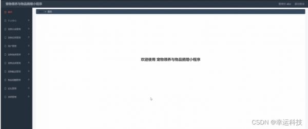 管理员登陆系统后,可以对首页、个人中心、宠物分类管理、宠物信息管理、用户管理、宠物领养管理、宠物送养管理、宠物配送管理、物品捐赠管理、论坛管理、系统管理等功能模块进行相对应操作,如图5-9所示。