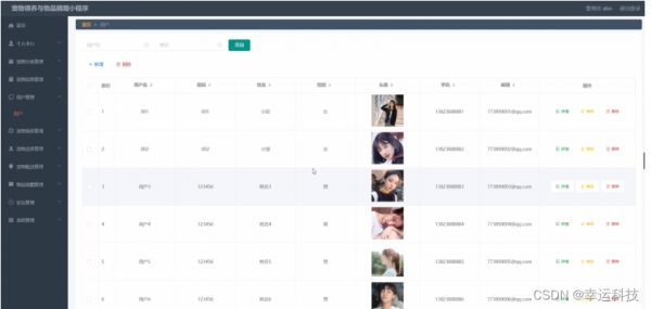 用户管理,在用户管理页面可以查看索引、用户名、密码、姓名、性别、头像、手机、邮箱等信息,并可根据需要进行修改或删除等操作,如图5-12示。