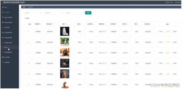 宠物配送管理,在宠物配送管理页面可以查看索引、订单编号、宠物名称、图片、性别、订单状态、更新时间、注意事项、用户名、手机、送货地址等信息,并可根据需要进行修改或删除等操作,如图5-15示。