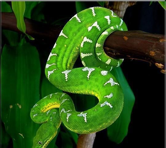 4/9翡翠树蟒蛇:这是一种美丽的蟒蛇,主要分布于亚马逊流域热带雨林。一般喜欢生活在巨大的树上。