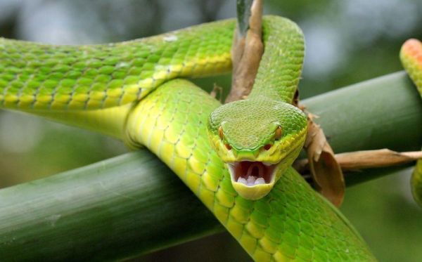 8/9竹叶青:常年吊挂或缠在树枝上,通身背面多为绿色与鲜绿色。主要生活于我国长江以南大部分地区,具有很强的攻击性,有毒……