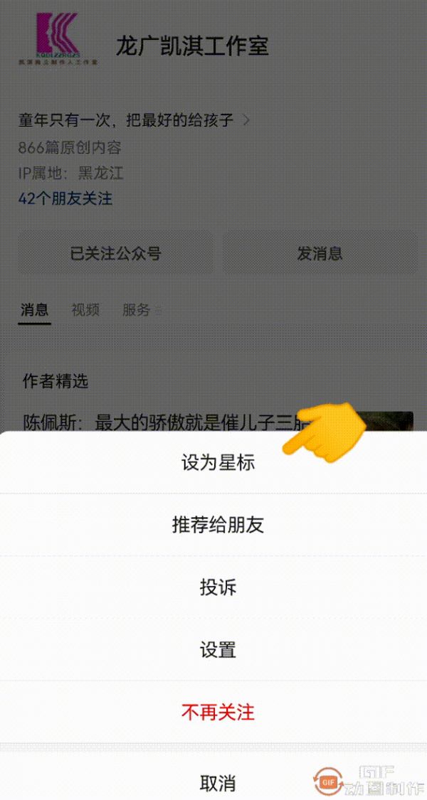 点开文首的蓝字“龙广凯淇工作室”,进入公众号。