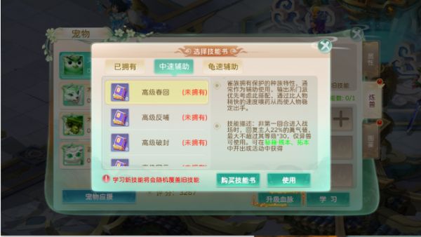2、宠物可以通过使用技能书学习新技能,学习过程中会随机顶替已学习的技能。
