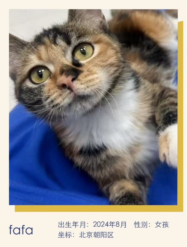 救助故事:fafa是24年10月抓捕大猫绝育时误进笼子的,那时候还是不到3个月的小朋友,异常亲人。不忍放归就寄养在医院找领养。结果得了猫瘟传腹,后来勇敢战胜病魔的小猫找到了领养,以为会永远这么幸福下去....可惜领养人无力继续照顾fafa,希望能重新给fafa找一个稳定的真心喜欢它且能多陪伴它的主人。