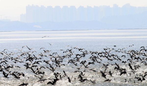 “鸬鹚大军”在深圳湾觅食。深圳特区报&读特记者 李忠 摄