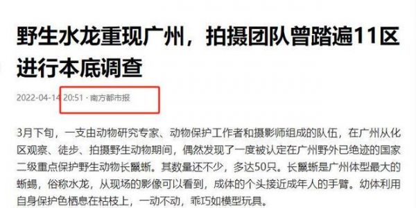 南方都市报《野生水龙重现广州,拍摄团队曾踏遍11区进行本底调查》2022-4-14