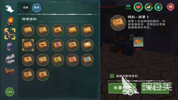 因为如果大家想要抓到一只暴力兔的话,那么差不多要用20个饲料才可以,想要合成这么多饲料一共要用到100个胡萝卜,这个100就是大家需要找到胡萝卜的最小的数目了,为了保险起见,大家还是一下子多找几个胡萝卜比较好。当收集到了足够多的萝卜之后,我们就可以去工具台上合成我们要用的胡萝卜包了,想要合成一个包一共需要5个萝卜,大家就一次性多合几个包出来就行了。