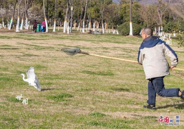 动物救护站的工作人员用网兜将受伤小白鹭控制住,以便安全带回动物救护站。
