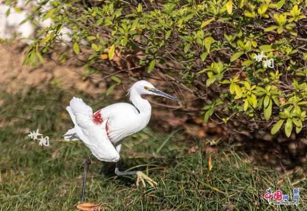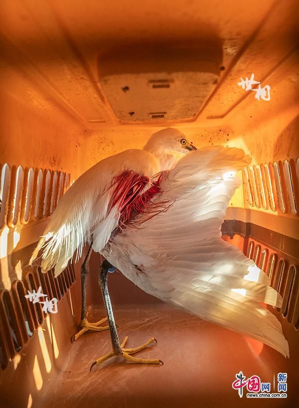 可怜的小白鹭胳膊受伤,伤口正不断向外流血,周边纯白的羽毛被鲜血染的殷红。