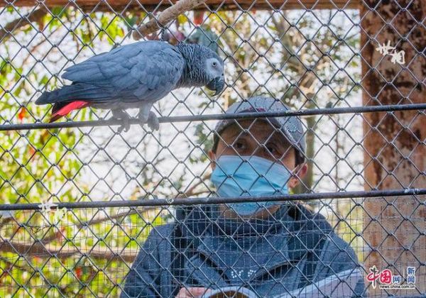 动物救护站的工作人员杨云正在查看被救助的非洲灰鹦鹉的恢复情况。