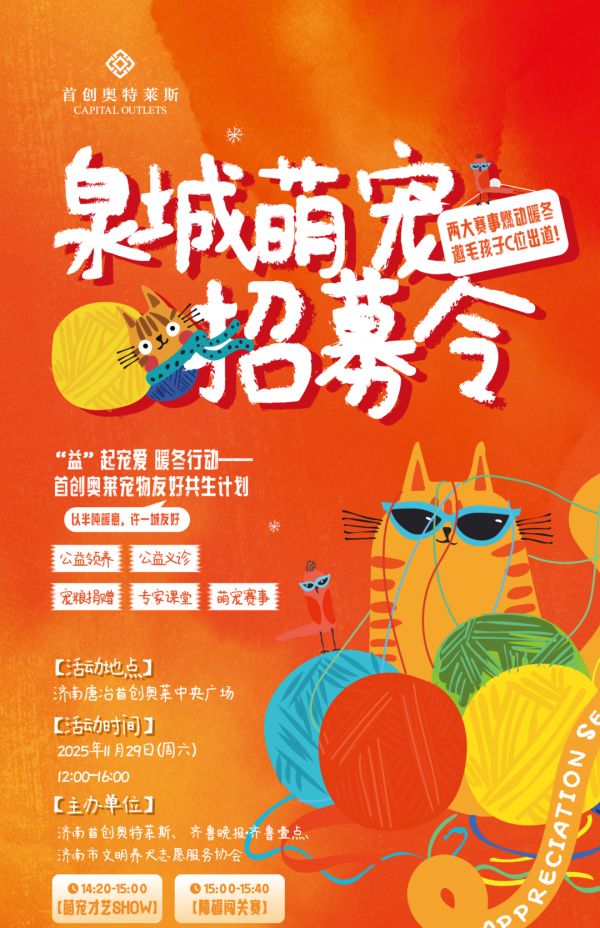 这个周六,欢迎泉城市民携宠齐聚济南唐冶首创奥特莱斯,在赛事中收获快乐,在公益中传递温暖,共赴这场充满温情与活力的宠爱之约。