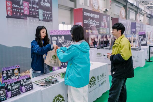 现场展区以 “纯正营养、源于自然、天生冠军” 为主题,陈列核心宠粮系列并开放试用。工作人员手持营养手册详解进口原料配比,旅行装、CHARM野性魅力五大超能鲜食罐等产品引发排队申领,首日互动量突破 2 万人次。
