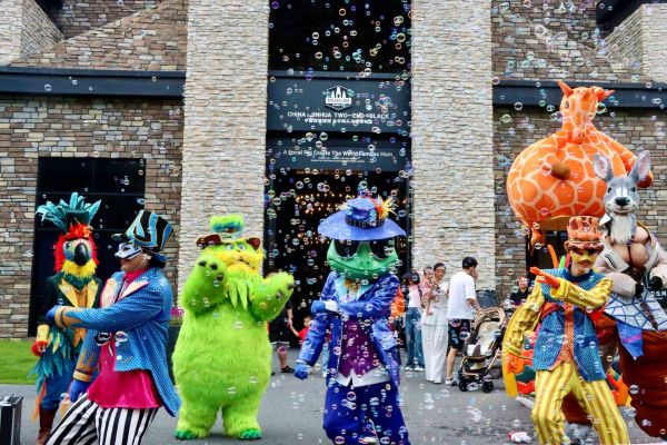 巡游车上,戴着熊猫猪猪人形玩偶或唱或跳,黑白相间的造型与粉色猪鼻格外吸睛。紧随其后的是身着礼服的青蛙先生、蹦跳前行的袋鼠力士,以及毛茸茸的羊驼和造型各异的怪兽玩偶。它们俏皮表演与强烈视觉冲击引得现场大朋友小朋友欢笑不断。