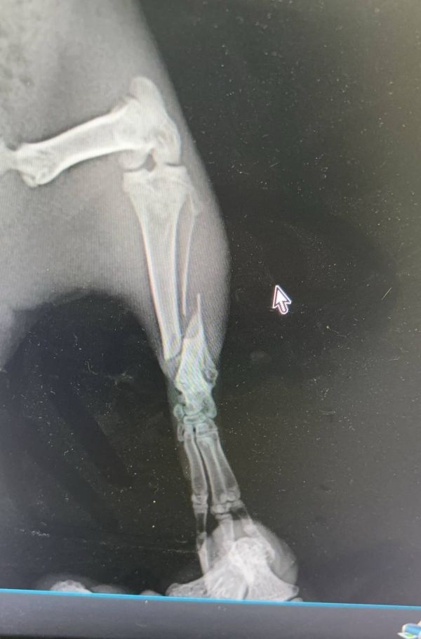2周前上班路上,前面一辆电动自行车带着一只狗,在躲避行人的时候车猛的拐弯,车倾斜的时候狗顺势下地,后车轮从狗腿上碾过,瞬时血肉模糊。立刻用衣服铺在地上,给狗放在羽绒服上整体托起,赶快送到医院X光检查,一条腿只是表皮蹭掉一块肉,另外一条腿尺骨骨裂,颈椎和脊椎没有明显的骨裂。因为没有彻底断裂,所以没有做内固定,在外面用夹板固定,随后对皮肉伤进行消炎治疗。经过1周后精神和食欲才逐步恢复,狗狗尝试站起走路,排除脊椎受损可能,慢慢走出惊吓的阴影,这如果压过的是脖子或者脊椎,面临的可能就是后半生的瘫痪了。