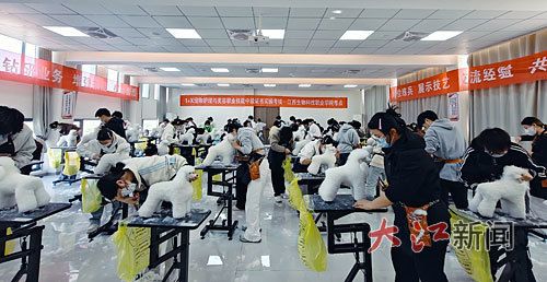 11月30日,江西生物科技职业学院学生正在参加“1+X”宠物护理与美容职业技能等级证书实操考核。(受访单位供图)