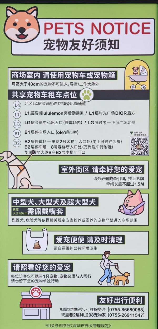 海岸城作为宠物友好商场, 2楼服务台可以自助扫码租借宠物用具,不过按照要求只能将宠物放置在宠物推车内,才能进入室内。