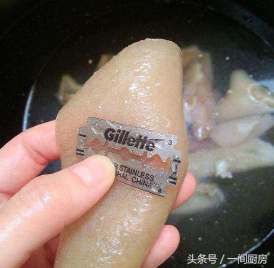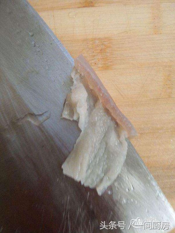 煮好后,放冷水清水几遍,用刀片刮干净猪皮上残留的毛。