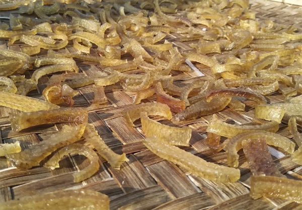 1. 猪皮选料:首先要选择无疫病表面无疤痕的猪皮,将选好的猪皮在温水中浸泡30分钟,洗净表面污渍,将猪皮表面杂毛连根拔除,刮除猪皮附着的脂肪,烘干之前要保证猪皮上没有一丝脂肪,之后根据市场需求将猪皮切块、切丝或者切丁,再将切好的猪皮放入烘干盘。