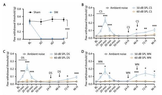 低强度的声音相对于环境噪声增加了CFA小鼠的伤害感知阈值 。