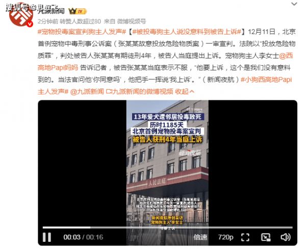 12月11日,在小区里给狗投毒的张某,被判四年有期徒刑。张某手一挥,当庭表示上诉。
