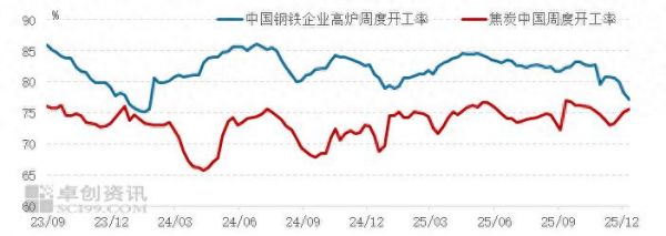 -1.04-3.42本周黑色产业链上游开工仍然有升有降,下游高炉开工维持下滑,焦化厂开工继续提升,整体供需基本面趋宽松。本周国内矿山周度开工率略降0.32个百分点至49.83%,较上月均值略降1个百分点;近日焦煤价格持续下滑,焦化厂盈利情况良好,整体生产积极,焦炉开工继续提升,焦炭供应小幅增加为主。截至12月12日,独立焦企开工负荷75.67%,较上周增加0.49个百分点,较上月均值增加2.03个百分点。本周钢材价格下滑为主,钢厂亏损增加,高炉检修、减产增多。截至12月11日,全国高炉开工率77.16%,环比略降1.04个百分点,较上月略降3.42个百分点。冬季钢厂需求季节性转弱,高炉开工率维持下滑趋势。