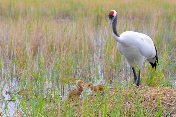 在黑龙江扎龙国家级自然保护区,两只丹顶鹤雏鸟在亲鸟的关注下活动。(王勇刚 摄)