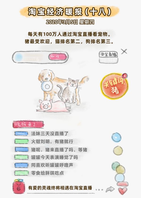 它们和其他淘宝上日益增多的“不怎么像淘宝直播”的案例一起组成了一系列令用户感到新鲜的直播体验。《淘宝经济暖报》显示,春节以来,淘宝平台上和宠物相关的直播开播场次同比增长了近375%。宅家的日子里,每天有100万人在淘宝看宠物。