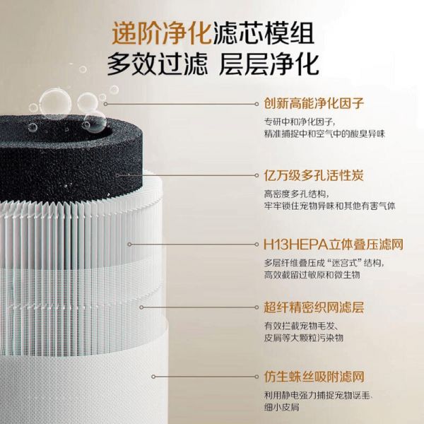 采用多层过滤技术,产品搭载H13级HEPA滤芯和独特的活性炭滤芯,带来卓越的净化效果。这一系统能够高效截留和中和各类异味,保持空气的新鲜感。无论是宠物毛发、污浊气体还是其他固态污染物,都能轻松应对,自信呼吸更清新的空气。