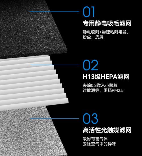 优质机型必备三层滤网:初效滤网能够阻挡猫砂粉尘等大颗粒污染物;HEPA13级滤网可过滤 0.3微米规格的污染物(诸如宠物皮屑、霉菌孢子);光触媒过滤层,能够分解氨味、硫化氢这类宠物异味。