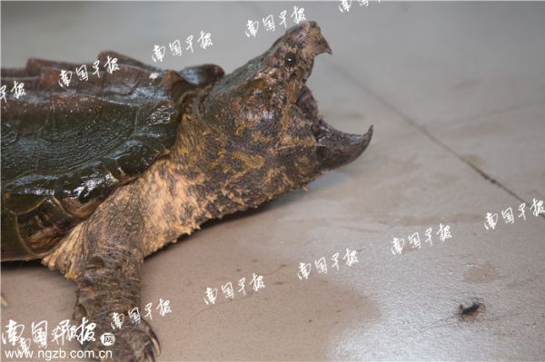别看这只大鳄龟安静地在水里呆着,当小谢把这只鳄龟从缸里移到地面上时,它立即张大嘴巴,朝着有人的方向奔跑。“它的咬合力很强,不能摸它,否则会被咬。”为了向记者证实它的攻击性,小谢将一块磨刀石放在它嘴边,这只鳄龟用力一咬,发出“咔”的一声响,“如果是手指,早就被咬断了”。