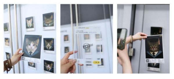 巨幅海报的下半部分设有互动区,约5000份印有待领养猫咪信息的特制简历卡和特制透卡被悬挂在墙面上。特制透卡分为“上岸了”、“待上岸”和“学士帽”图案三款,参与者可以使用透卡拍摄“毛孩子们”,打卡并分享至社交媒体,为本次公益活动呼吁摇旗。