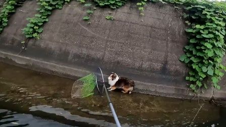 一只宠物狗掉落进河中,救援人员用渔网打捞,谁料狗狗却不领情