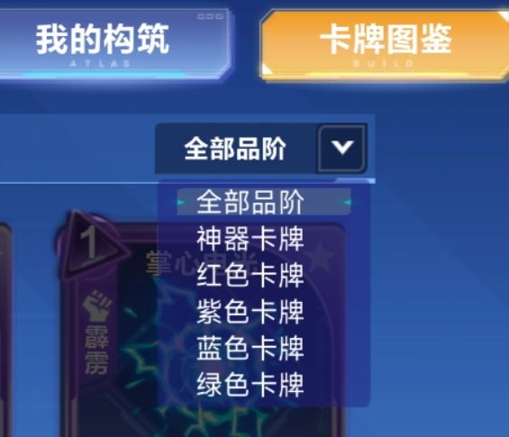 分别是:神器卡牌、红色卡牌、紫色卡牌、蓝色卡牌、绿色卡牌。
