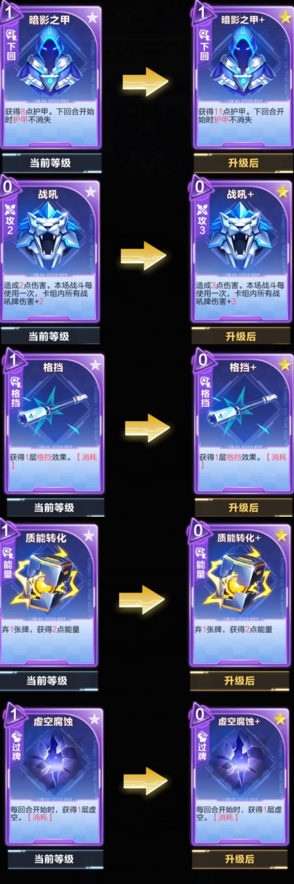 紫色卡牌推荐:暗影之甲、战吼、格挡、质能转换、虚空腐蚀。