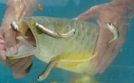 水族箱中繁殖的金龙鱼产卵前,两尾金龙鱼开始停食,雌鱼腹部开始增大,金龙鱼尾巴和尾巴紧紧粘在一起,或在对方的背上亲密地靠在一起,雌鱼产完卵,雄鱼立即将一颗颗鱼卵含人口中,经过60天左右,幼鱼苗开始在雄鱼的口中跑进跑出。