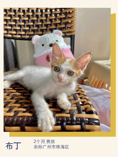 其他信息:布丁大概2个月,是高颜值小猫仔一枚,性格粘人,适应能力强,不会认生。现在已经养成了良好的生活习惯,会用猫砂。它是我在小区里救助的流浪猫,希望能遇到有爱的铲屎官~