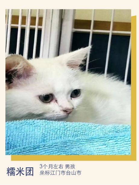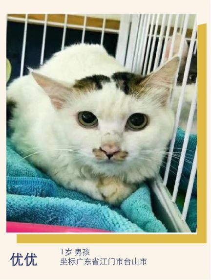 其他信息:优优本是一只有家的宝宝,因为不会繁育,被主人卖给猫肉店!我从商家那救助下来,宝宝一脸惊恐,很害怕但是没有任何攻击行为,小夹子音,喜欢被人摸头摸肚肚,喜欢与人互动,非常亲人!很难想象这么可爱的宝宝被主人抛弃!希望给他一个进入家庭的机会,下个爱他的人会是你吗?