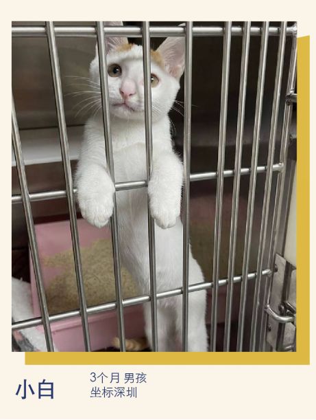 其他信息:小白是在有一天在小区隔壁的石头缝里发现的。晚上只有他一个在那奶声奶气的叫,喂了点吃的就走了,第二天居然发现它出现在小区里了。这么小的猫咪又下雨又自己跑过来小区里,展现出了浓浓的求生欲望!又只有它一只小奶猫太可怜了,喂养几次后就救助它到医院,小家伙到医院碰到毛毯就出现踩奶和满意的呼噜声。实在太可爱了,希望能帮它找到一个一样温柔可爱的主人。