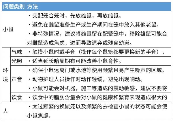 根据繁育策略建立好繁育笼后,还是会出现各种各样的问题影响小鼠繁育,遇到问题时可参考下表进行改善: