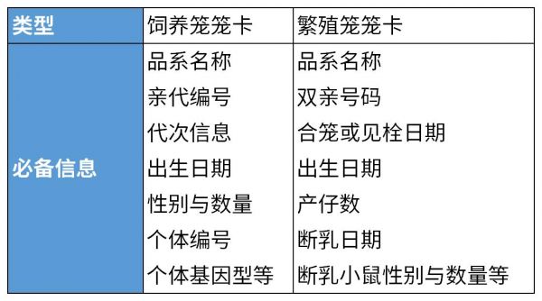 笼卡分为饲养笼与繁殖笼,两者包含信息见下表: