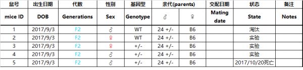 除了笼卡以外,我们还要用表格把所有的小鼠情况汇总记录下来,可以包括小鼠的编号、出生日期、代次、性别、基因型信息、亲代小鼠信息、交配日期、目前状态、体重信息等等,便于统计与管理。
